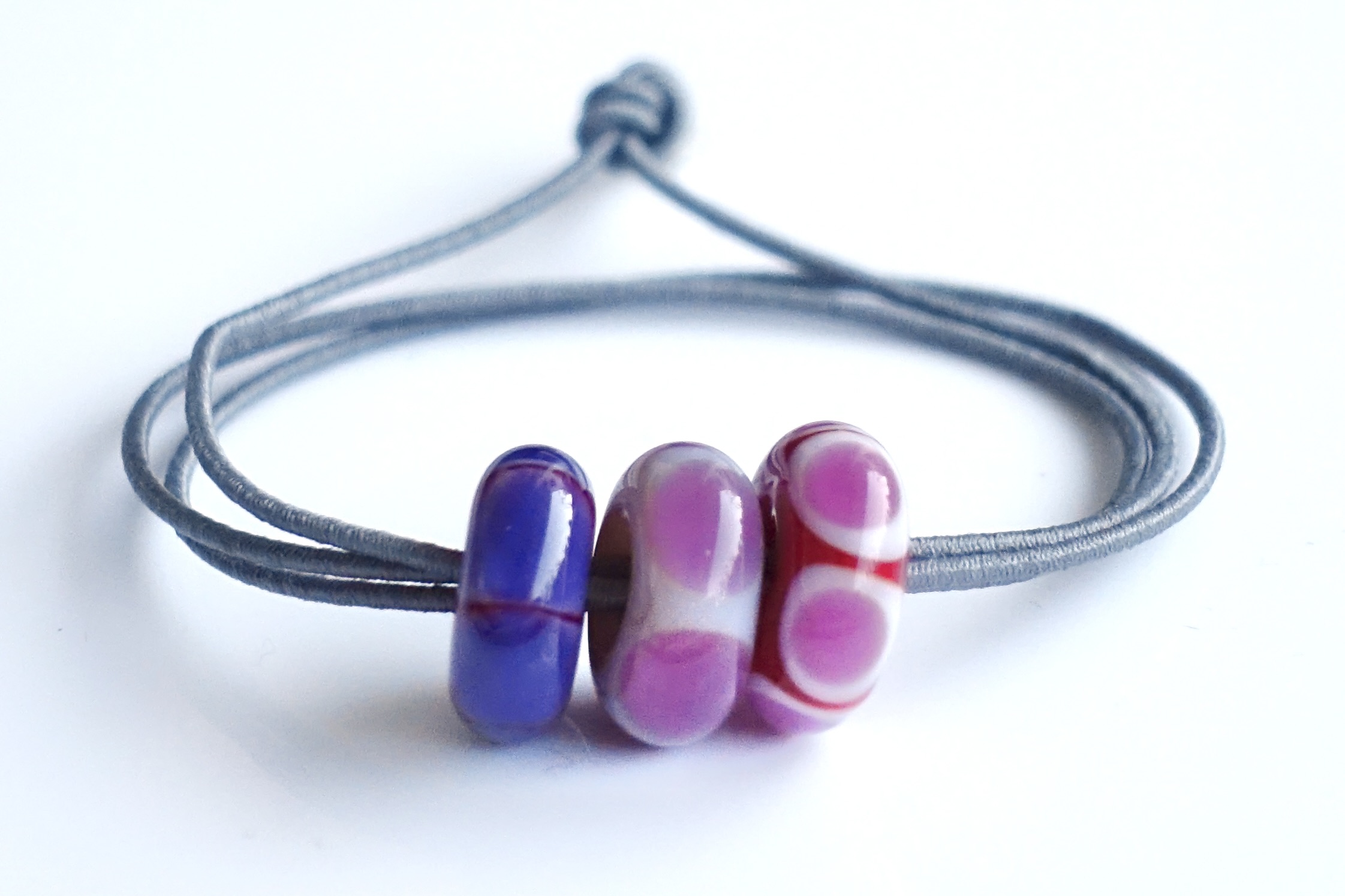 Three matching, one-of-a-kind, handmade glass beads on a flexible 60 cm textile cord, with silver caps. Can be worn as bracelet or necklace.