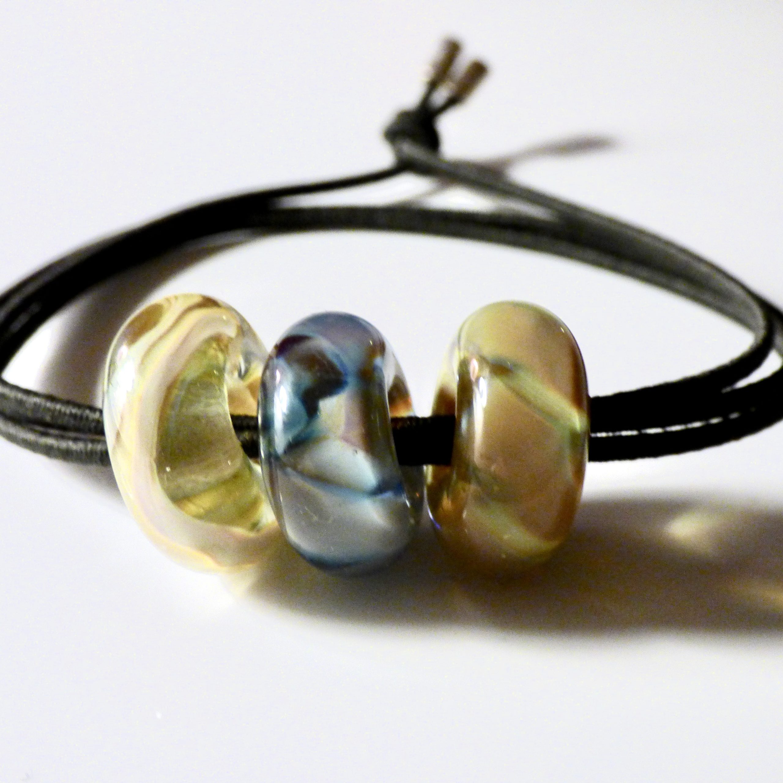 Three hand-made, coordinated glass beads in transparent shades were combined for this piece of jewelry.