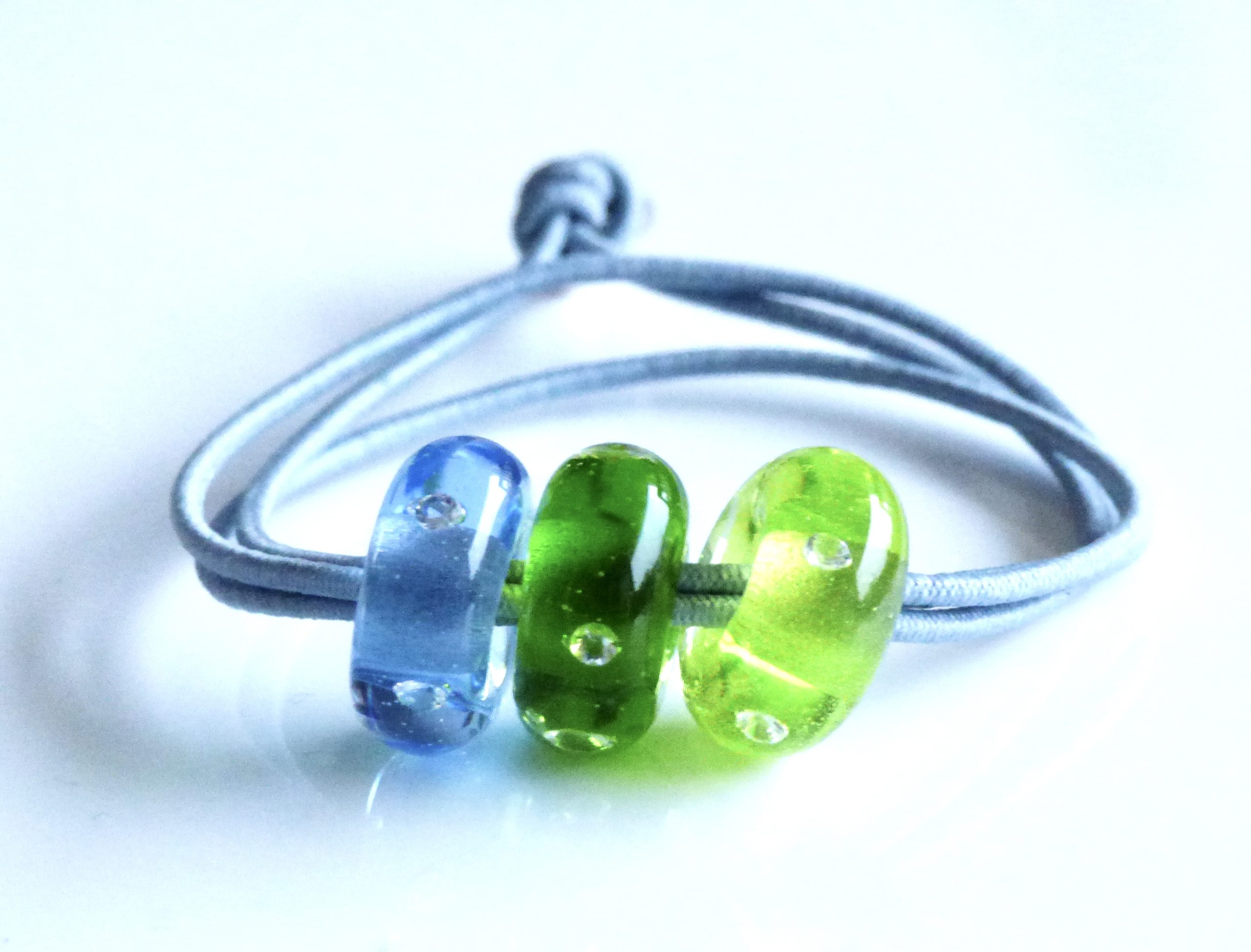This beautiful piece of jewelry consists of three lovingly handcrafted glass beads in harmonious colors. Each bead is decorated with 4 sparkling Swarovski crystals that magically reflect light.