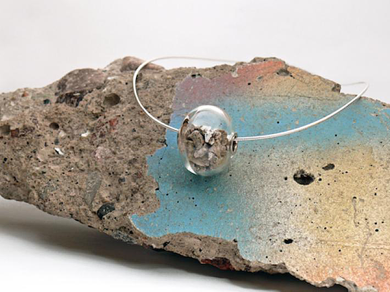 Berliner Mauerperle – ein Berlin-Accessoire der besonderen Art: handgefertigte Hohl-Glasperle, in der sich echte Berliner Mauerstückchen frei bewegen – versiegelt mit Echtsilber.