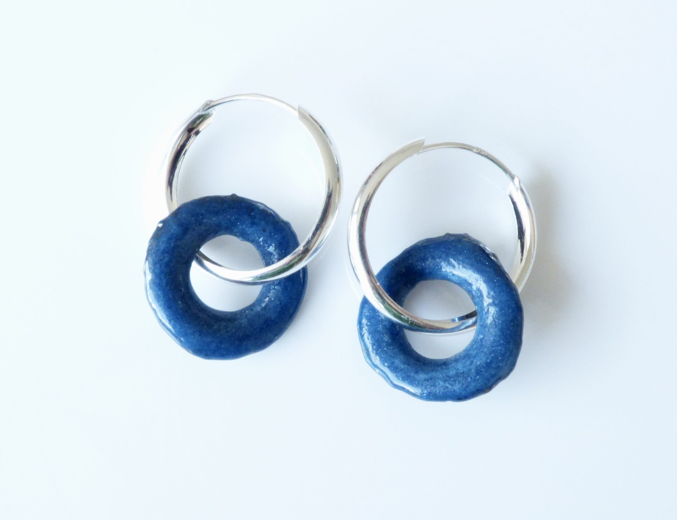 Earrings with “circles” made of kiln-melted glass in the color metal blue, front metal, back blue.