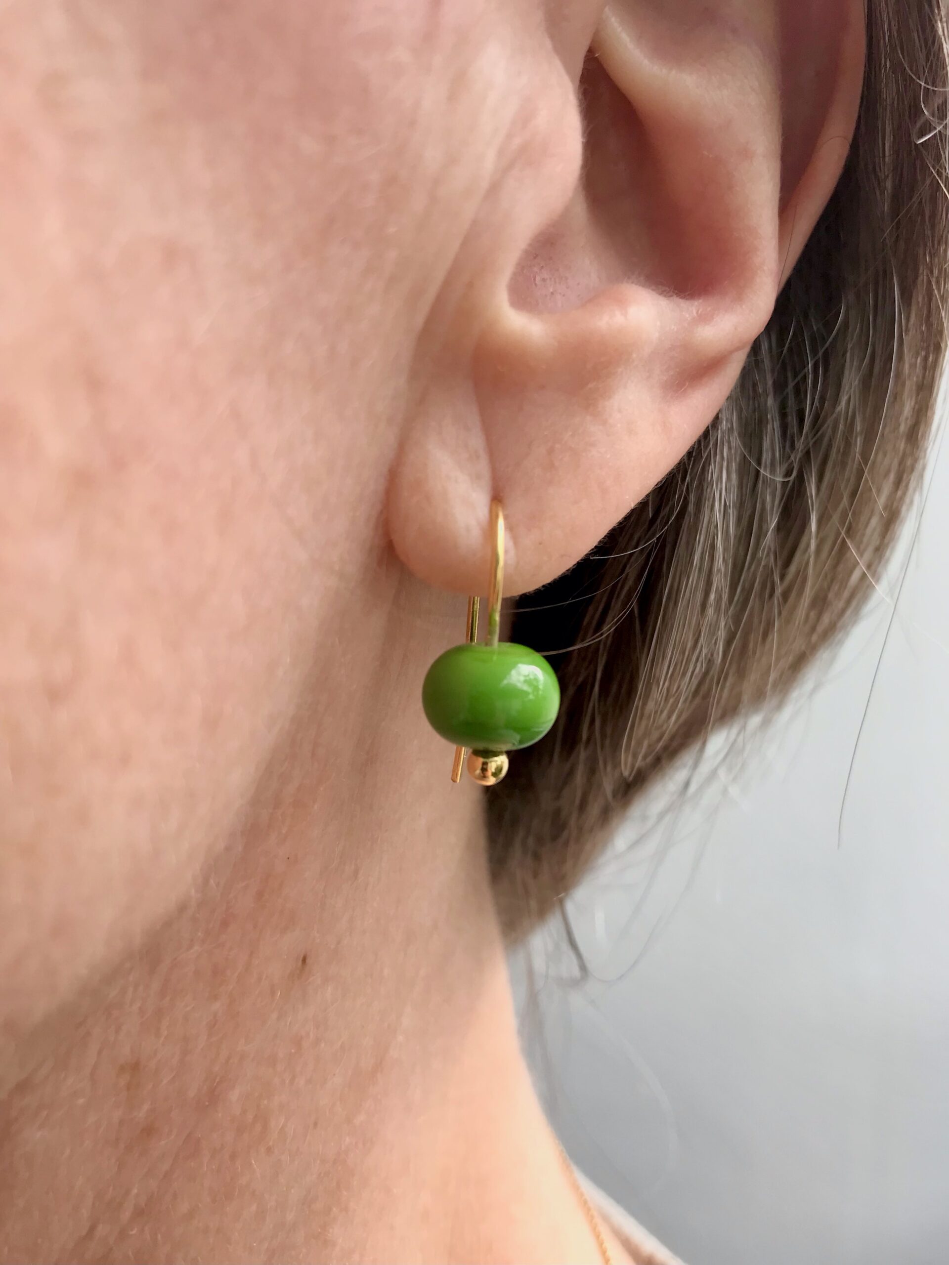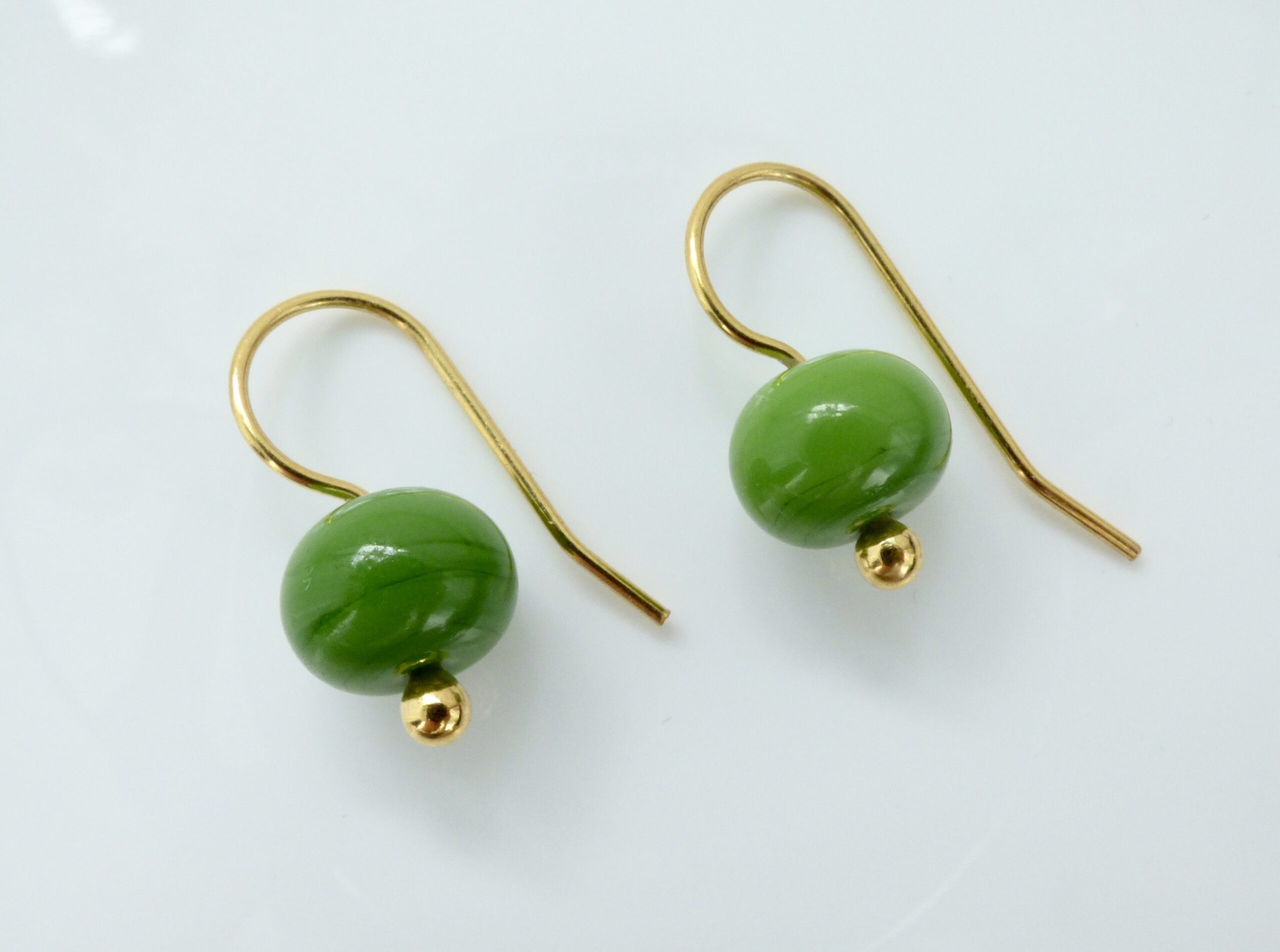 Hübsche, zarte Ohrhänger aus handgefertigen, grünen Glasperlen und 24 k vergoldetem Echtsilber.