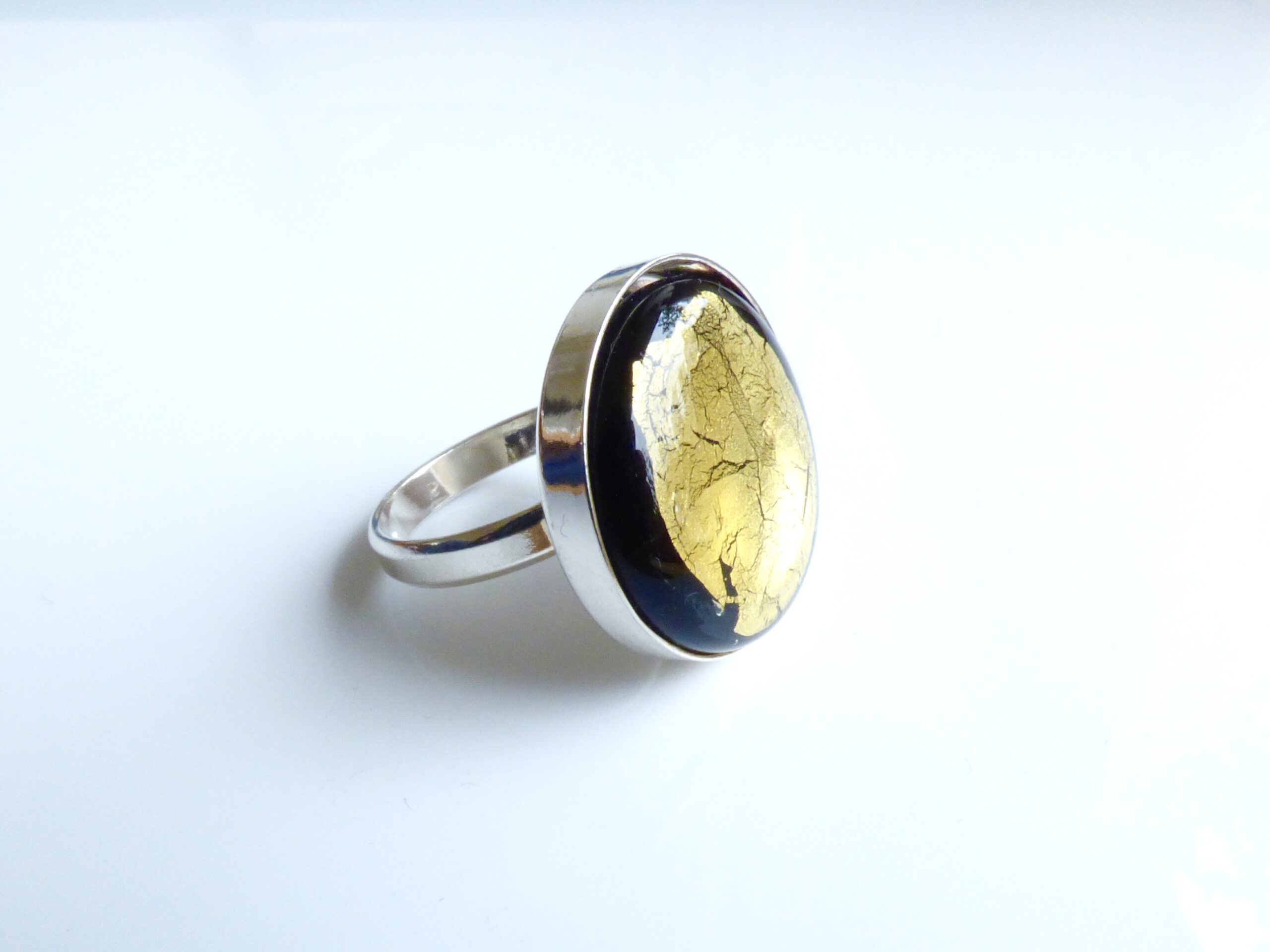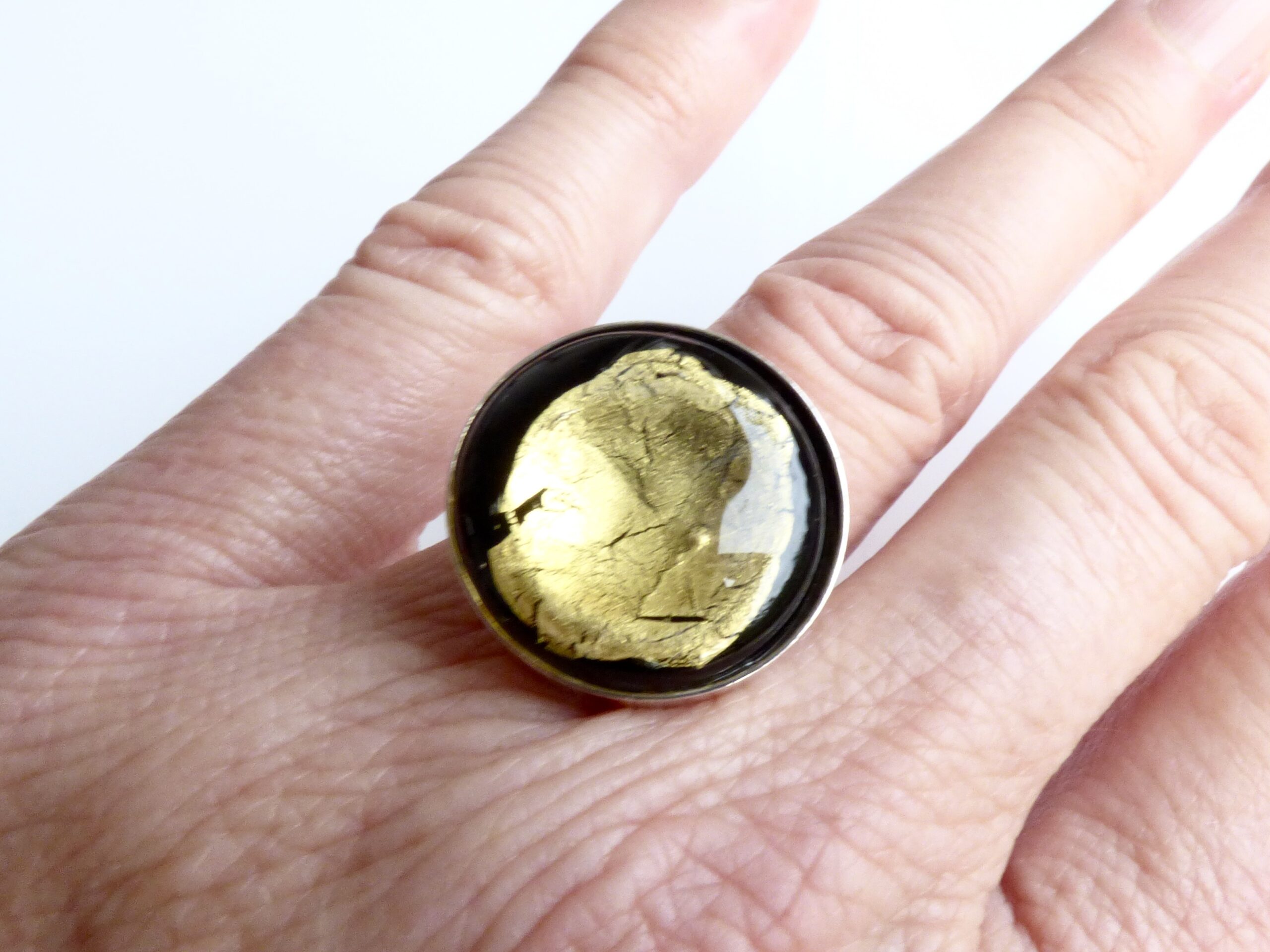 Ein edler schwarzer Glas-Cabochon, verziert mit 24k Goldfolie und einer transparenten Glasschicht, macht dieses Schmuckstück zu einem exklusiven Hingucker.