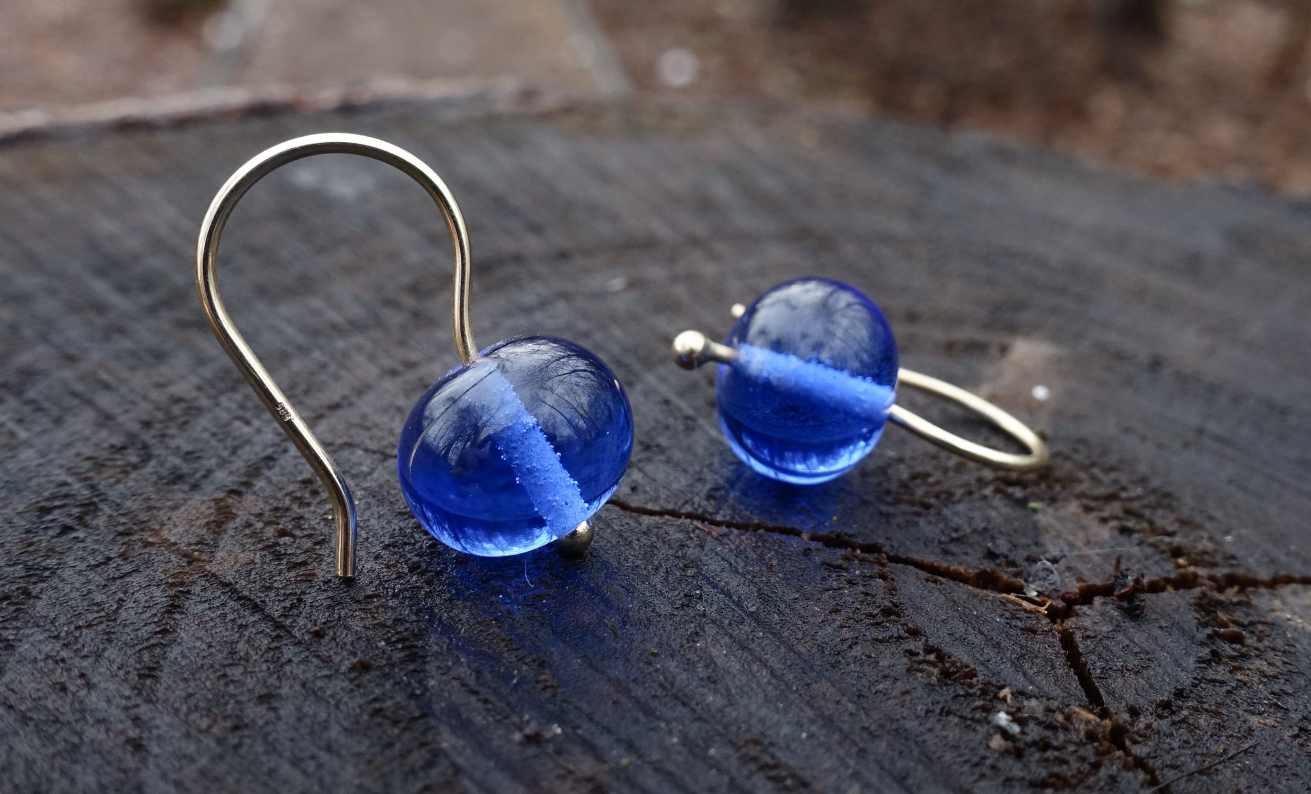 Handmade glass beads made of blue, transparent glass on an earring made of 585 yellow gold.