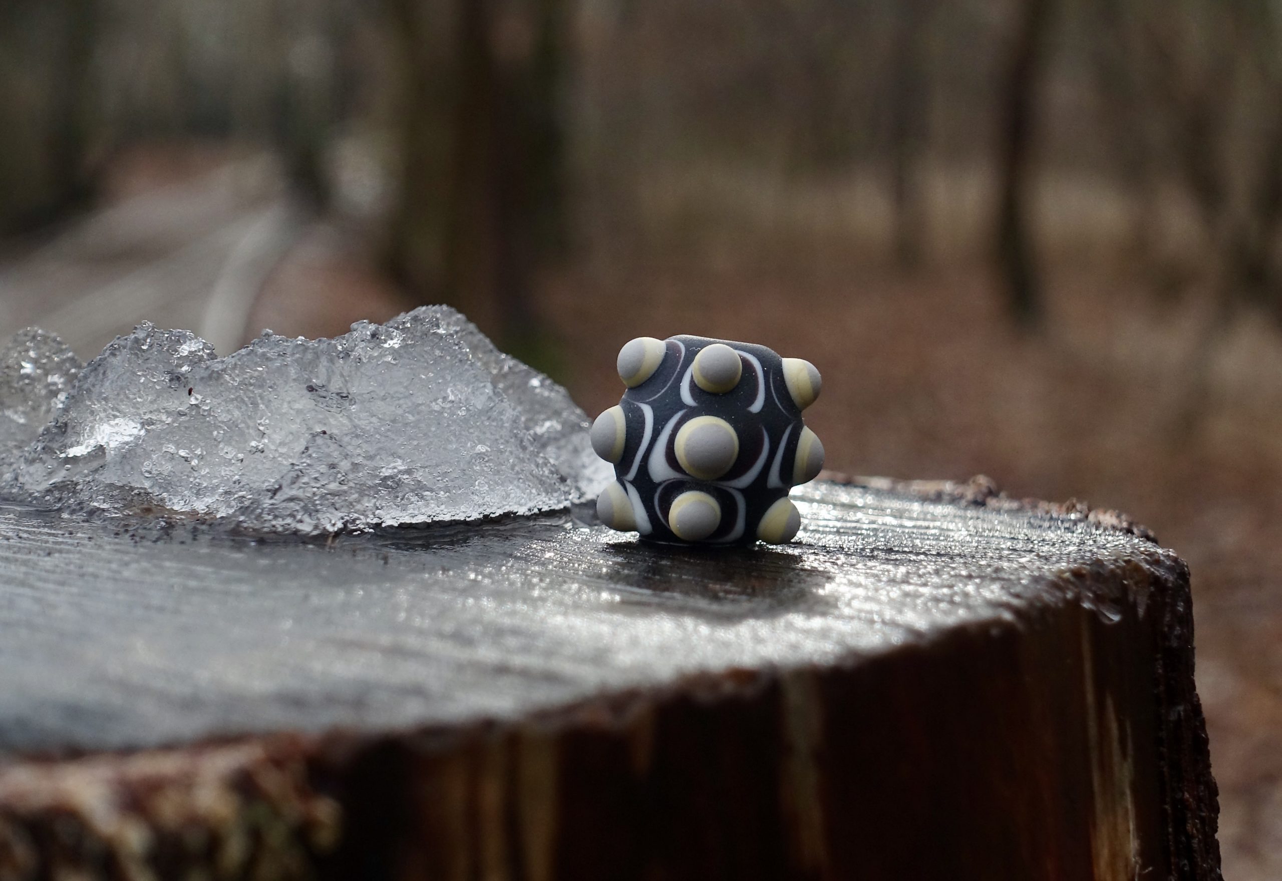 Handgefertigte, schwarze Unikat-Glasperle im Stil phönizischer Perlen der Antike, mit feinen Aufschmelzungen. Das Glas erhielt durch Sandstrahlung eine matt-seidene Oberfläche.