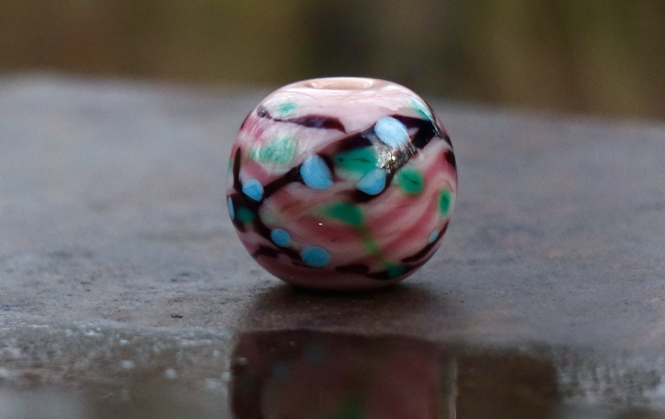 Handmade unique glass bead inspired by the colors of Japanese spring – the diameter of the bead is approximately 20 mm, the hole size is 3 mm