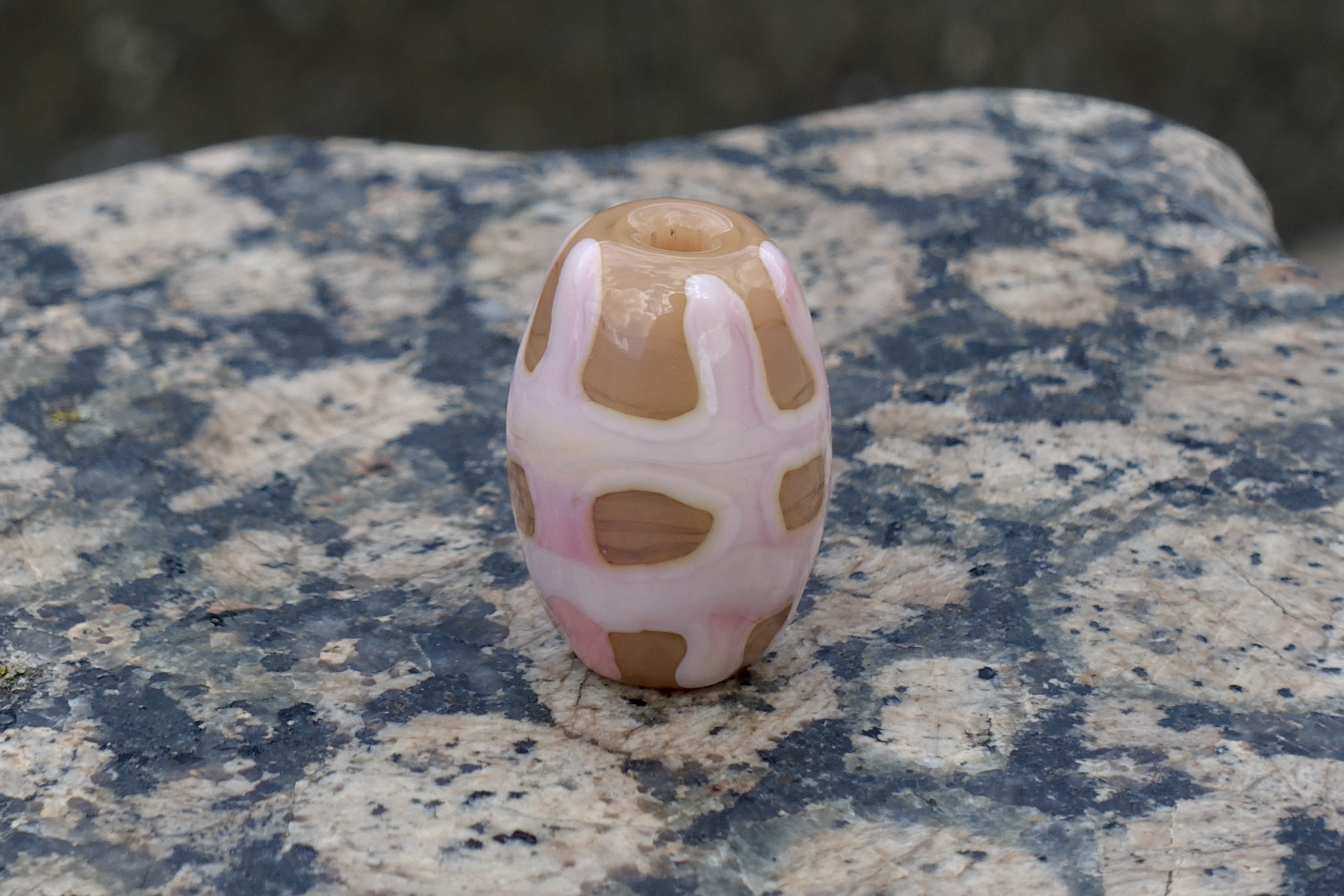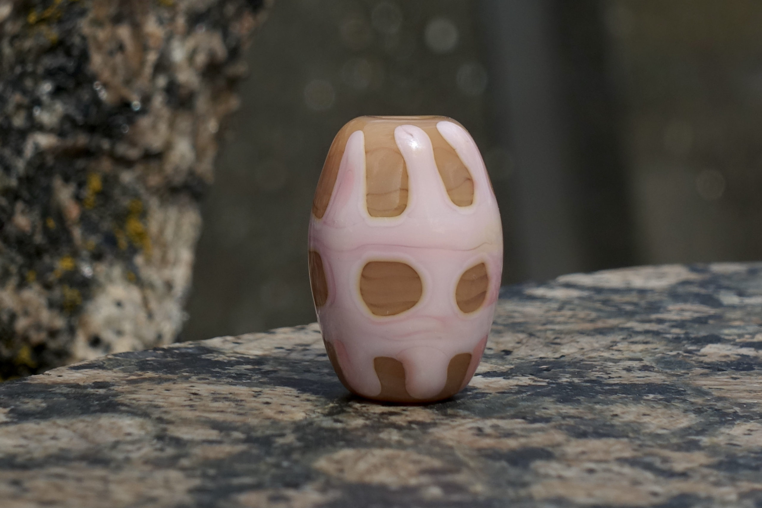 Handmade, cream-colored unique glass bead with rose-colored melts.