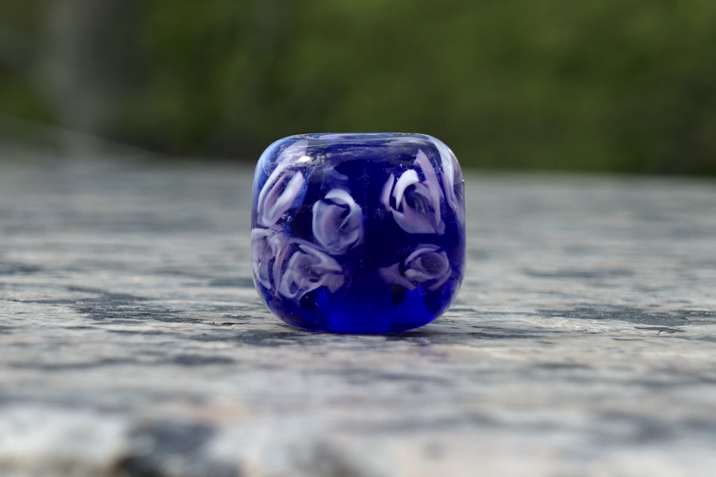Handgefertigte, dunkelblaue Unikat-Glasperle mit Rosen-Murrini – die Perle hat einen Durchmesser von etwa 17 mm, die Lochgröße beträgt 3 mm.